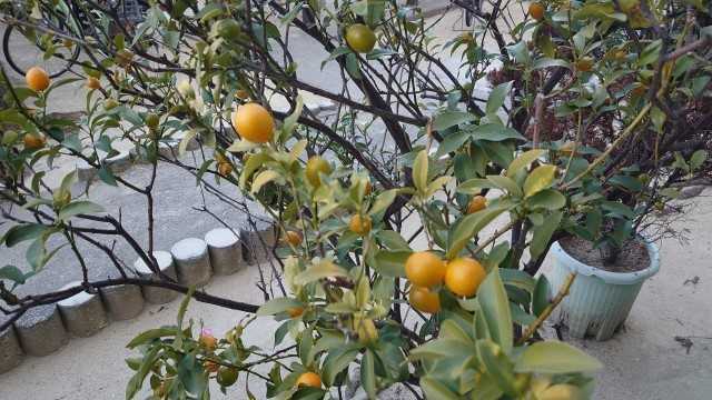 椿、金柑、キダチアロエ、マーガレット。