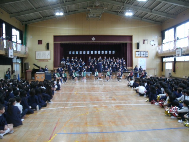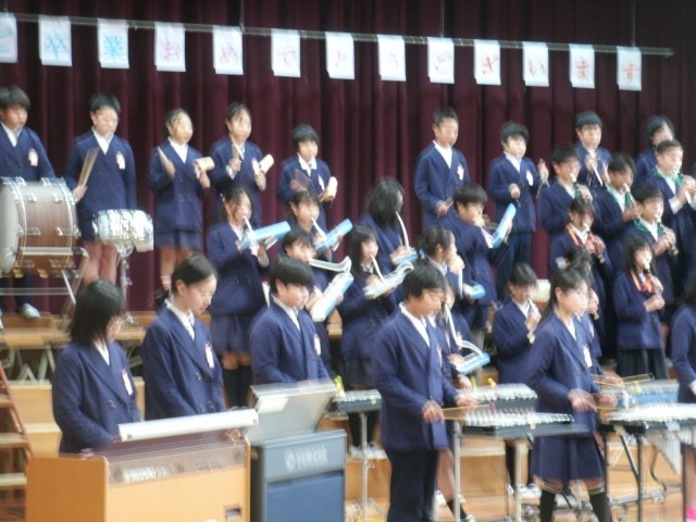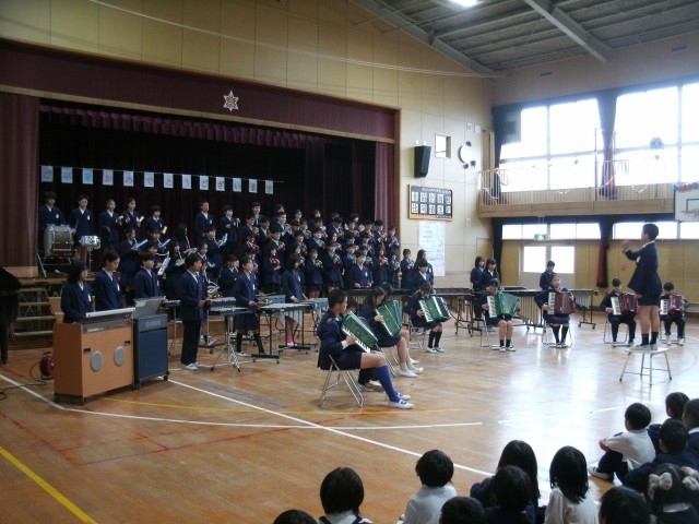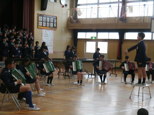下級生への御礼に合奏「HANABI]合唱「友」、そして手作りの雑巾を各学級にプレゼントしてくれました。