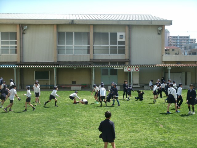 本校には素敵な芝生の中庭があります。始業式後の休み時間には、遊具で遊んだり鬼ごっこをしたりして楽しく遊んでいます。