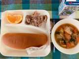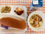 ポトフ カレーソテー やきプリン コッペパン、ブルーベリージャム ぎゅうにゅう