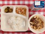 すきやきに もやしとささみのいためもの きゅうりのゆずふうみ ごはん ぎゅうにゅ...