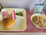 やきそば きゅうりのしょうがづけ いもけんぴフィッシュ ごはん 牛乳