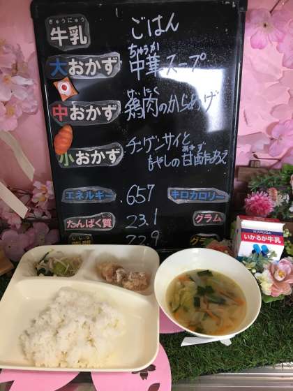 本日の給食は、「米飯、牛乳、鶏肉のからあげ、中華スープ、チンゲンサイともやしの甘酢あえ」でした。