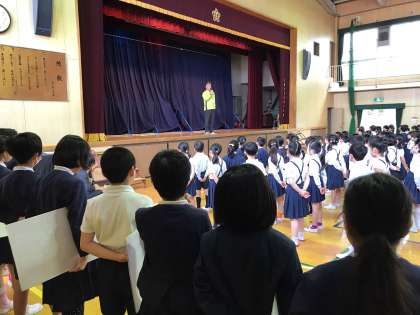 4月22日(月)、児童朝会がありました。校長先生からあいさつの大切さのお話を聞いたり、生活指導の先生から遊んではいけない場所についてのお話を聞いたりしました。