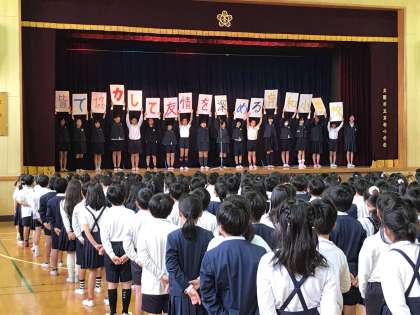 また、児童会から今年度の育和小学校のめあてについて発表がありました。今年度のめあては、「皆で協力して協力して友情を深める育和小学校」です。1〜6年生までしっかり協力して、このめあてを達成できるようにがんばっていきたいと思います。
