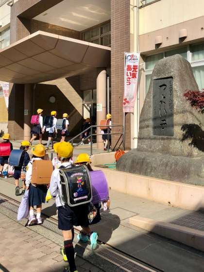 10連休が明け、「令和」元年がスタートしての登校のようすです。今朝も子どもたちはいつものように元気よく集団登校してきました。