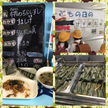給食では、こどもの日の行事献立にちまきが登場しています。