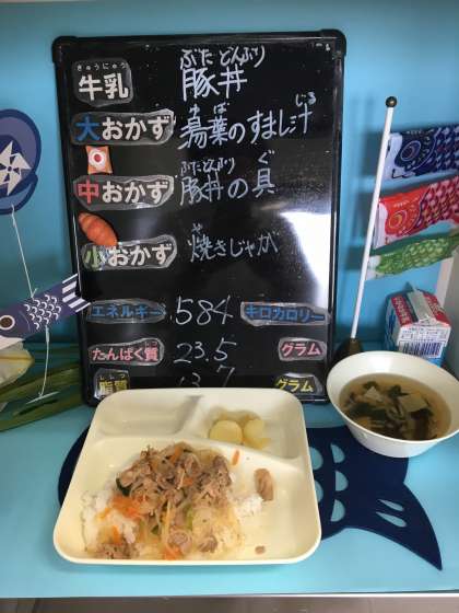 本日の給食は、「豚丼、牛乳、湯葉のすまし汁、焼きじゃが」でした。