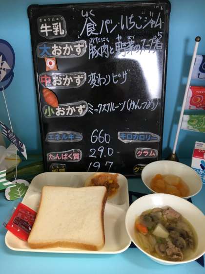 本日の給食は、「食パン、いちごジャム、牛乳、豚肉と野菜のスープ煮、変わりピザ、ミックスフルーツ(缶)」でした。
