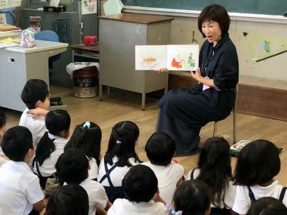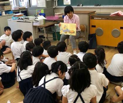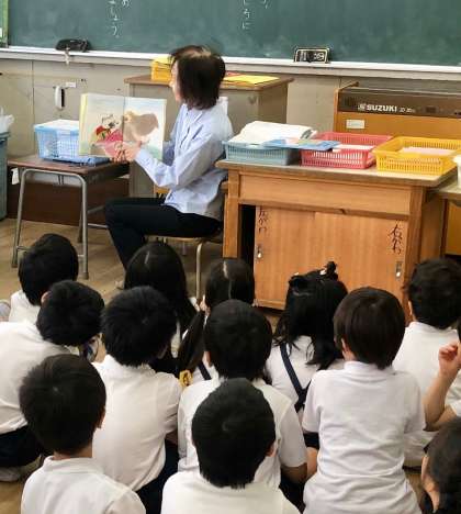 カラフルBOOKちゃん による1年生の朝の読み聞かせのようすです。