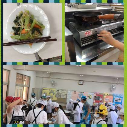 野菜の洗い方、包丁の使い方、調理器具の使い方などを学習し、とてもおいしい野菜炒めができました。
