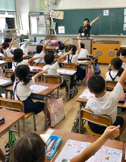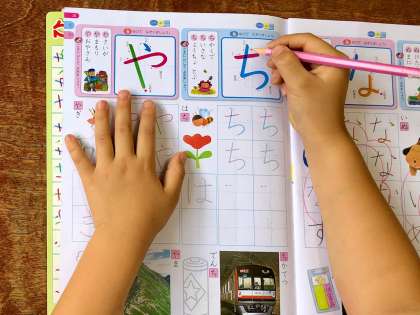 「とめ」「はね」「はらい」に気をつけて、平仮名の練習をしています。空書きといって空中で手をあげ大きく書くことは、筆順や運筆の練習につながります。