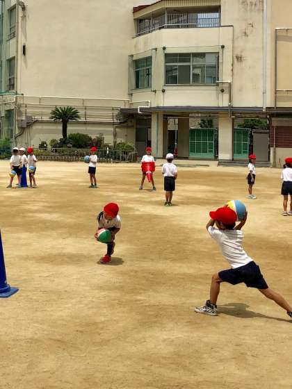 できるだけ的に向けて正確に力強く投げる練習をしています。