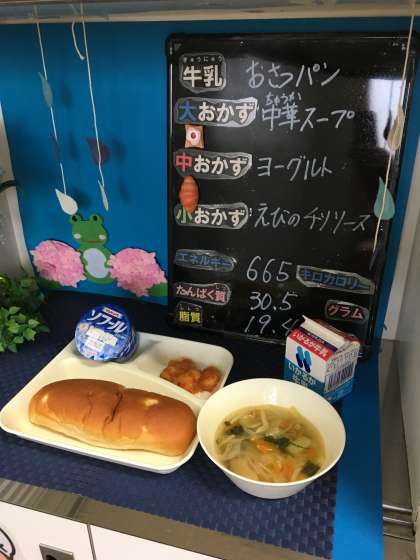 本日の給食は、「おさつパン、牛乳、えびのチリソース、中華スープ、ヨーグルト」でした。