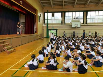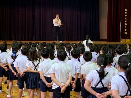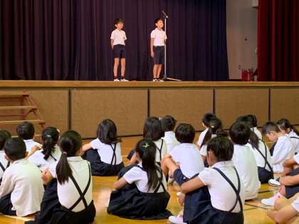 10日、講堂で児童朝会がありました。校長先生から紫陽花の花のお話があり、児童のみなさんも、紫陽花の花のように力を合わせて1つの花のようになってほしいと話されていました。