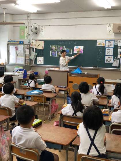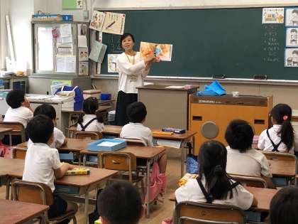 絵本「あめふりさんぽ」の読み聞かせを聞いた後、校庭の紫陽花を想起し、写真も見てイメージをふくらませているところです。