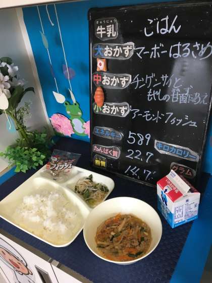 本日の給食は、「ご飯、牛乳、マーボーはるさめ、チンゲンサイともやしの甘酢あえ、アーモンドフィッシュ」でした。