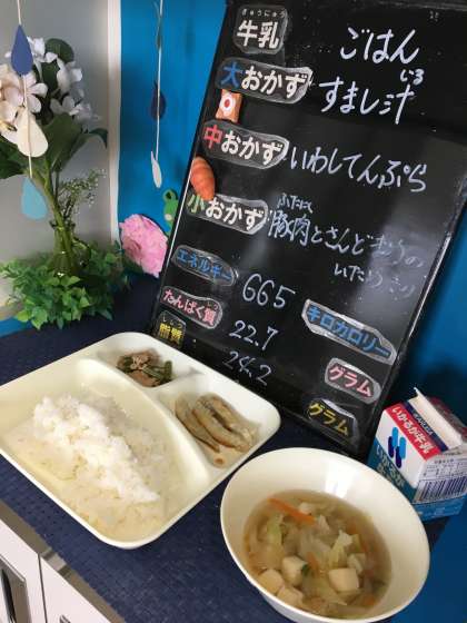 本日の給食は、「ご飯、牛乳、いわしてんぷら、すまし汁、豚肉とさんどまめのいためもの」でした。