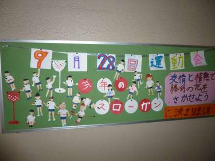 1階廊下の掲示板に掲げてある運動会の案内です。運動会は、平成26年9月28日(日)に行われます。よいお天気になりますように!