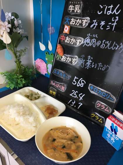 本日の給食は、「ご飯、牛乳、鶏肉のおろしじょうゆかけ、みそ汁、野菜いため」でした。