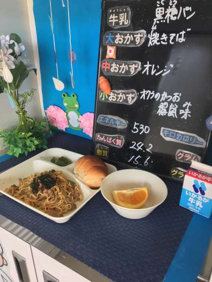 本日の給食は、「黒糖パン、牛乳、焼きそば、オクラのかつお梅風味、オレンジ」でした。
