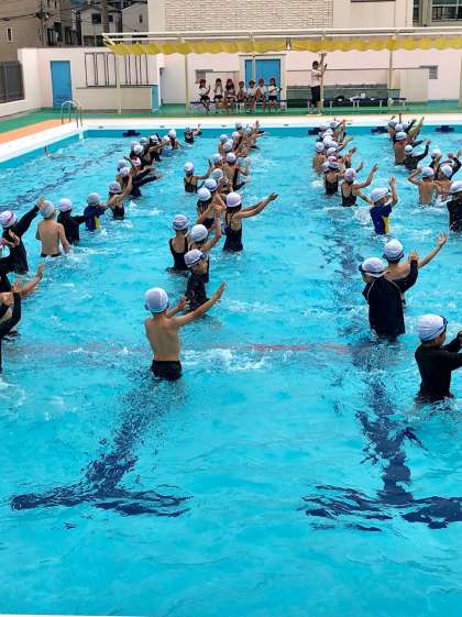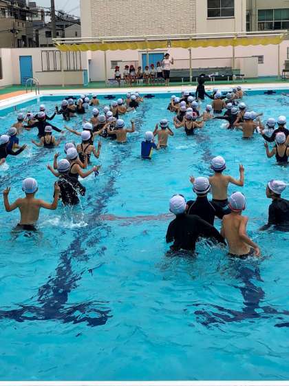 まず、1時間目は2年生です。音楽にあわせて水慣れのダンスをしました。