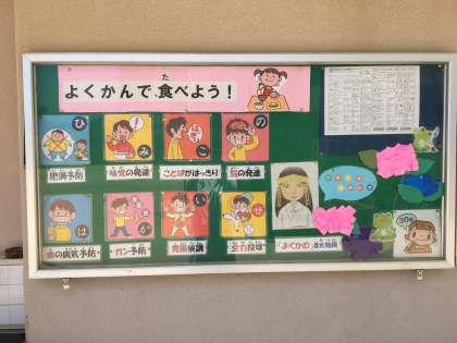 6月は歯と口の健康の週間がある月ということで、「よく噛むことの効果の大切さ」について給食室前に掲示しました。