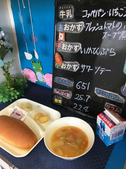 本日の給食は、「コッペパン、牛乳、いかてんぷら、フレッシュトマトのスープ煮、サワーソテー」でした。
