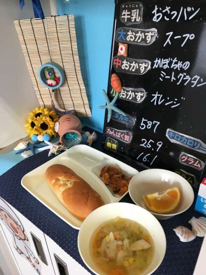 本日の給食は、「おさつパン、牛乳、かぼちゃのミートグラタン、スープ、オレンジ」でした。