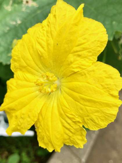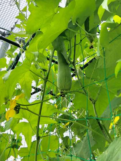 4年生が栽培している ヘチマが花を咲かせ、ヘチマの実が育ってきています。