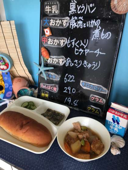 本日の給食は、「黒糖パン、牛乳、もずく入りヒラヤーチー、豚肉といかの煮もの、あっさりきゅうり」でした。