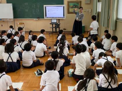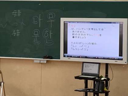 8日、4年生を対象に、本校の国際クラブ講師より国際理解教育の授業をしていただきました。今回のテーマは「ハングル講座」ということで、ハングルの成り立ちや、ハングルと日本語の共通点などを学びました。
