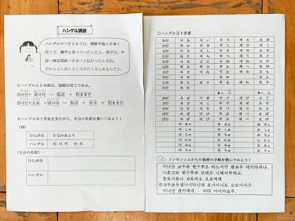 最後に、子どもたちは自分の名前をハングルで書いてみましたが、「めっちゃむずかしい〜」「何かかっこいい!」と嬉しそうに書いていました。本やテレビでハングルを見かけたときに、少しだけ読めるようになったかもしれませんね。