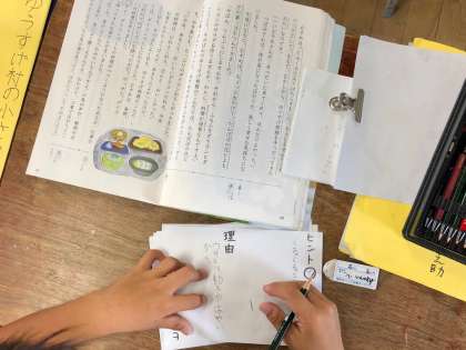 3年生が『ゆうすげ村の小さな旅館』を読み、登場人物の行動や会話などの物語の叙述に着目して、しかけを探す学習をしました。