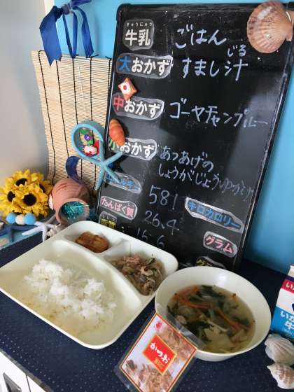本日の給食は、「ご飯、牛乳、ゴーヤチャンプルー、すまし汁、あつあげのしょうがじょうゆかけ」でした。