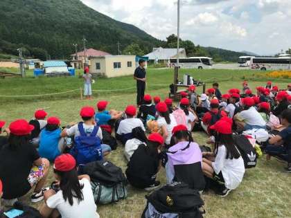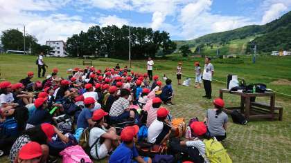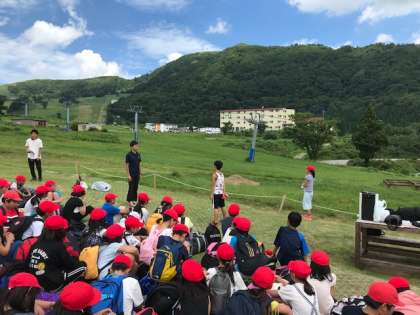 後ろの山は鉢伏山です。宿舎の方に、みんな元気に挨拶できました。日陰がないのが少し辛いです。