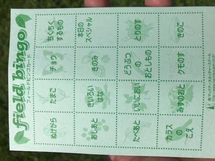 地図をたよりに、班ごとにオリエンテーリングを行います。途中にフィールドビンゴカードに書かれてあるものを見つけたら丸をします。