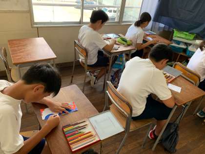 美術部では、色鉛筆を用いて2枚の絵を描きました。それを短冊状に切って、波状に折られた台紙に互い違いに貼ると、向きを変えるだけで一瞬で絵が変わる作品ができ上がりました。素敵なお土産ができました。