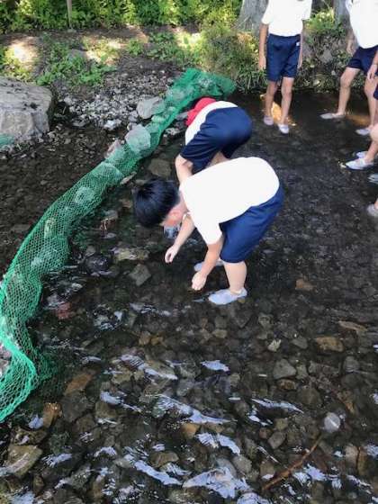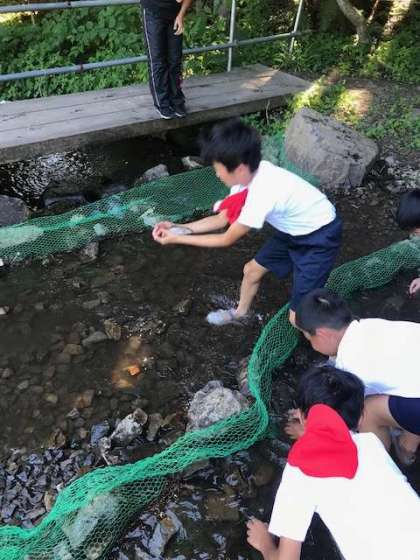 魚つかみは、きれいなニジマスを腹の部分と頭をやさしくおさえて捕まえます。