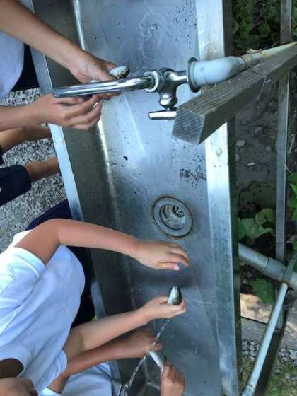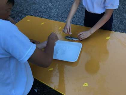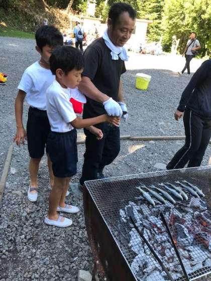 つかまえた魚はよく洗い、塩をひとつまみふりかけて、焼いてもらいます。
