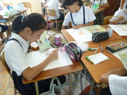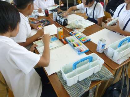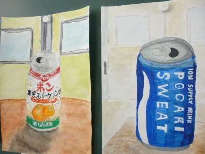 図工の時間です。めあては「本物そっくりに描こう」です。空き缶の色彩やデザインを丁寧に観察し、慎重に絵筆を進めました。