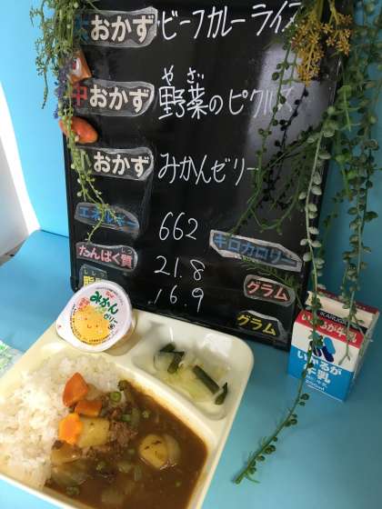 本日の給食は、「ビーフカレーライス[米粉]、牛乳、野菜のピクルス、みかんゼリー」でした。