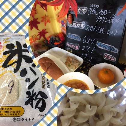 本日の給食は、「おさつパン、牛乳、豆乳マカロニグラタン[米粉]、トマトスープ、みかん(冷)」でした。