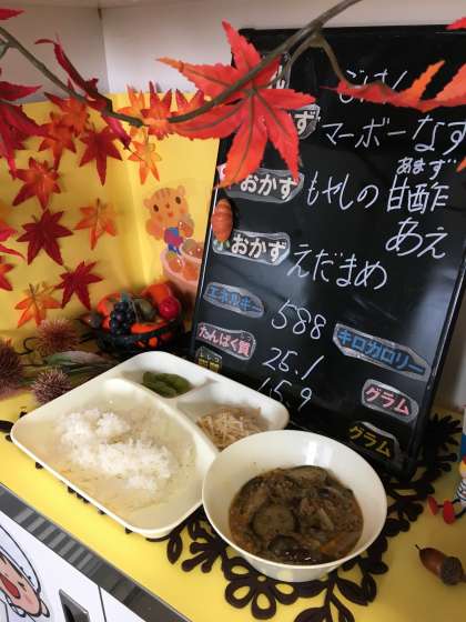 本日の給食は、「ご飯、牛乳、マーボーなす、もやしのごま酢あえ、えだまめ」でした。