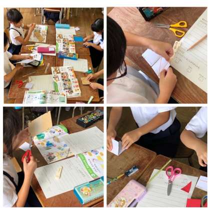「うごく うごく わたしのおもちゃ」の単元で、「パッチンガエル」をより高く、よりはやく、おもしろいとび方を工夫してつくり、動くおもちゃの不思議さや面白さについて考えました。