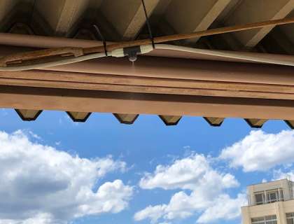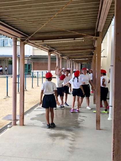 そこで、先日管理作業員さんがミストシャワーを設置してくださいました。体育館横の渡り廊下には涼を求めて子どもたちが集まっていました。