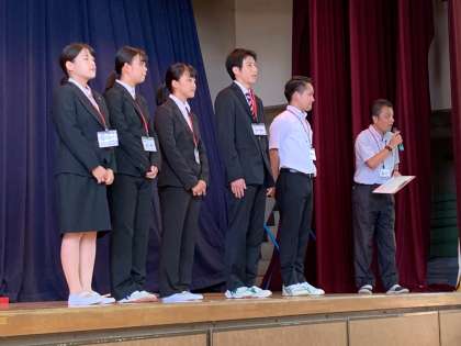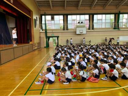 まずは、今週から子どもたちと一緒に過ごす5名の教育実習生の紹介がありました。2年生には城山先生、3年生には小森先生、4年生には岸本先生、5年生には松井先生、6年生には笹井先生が入られます。5名の中にはすでに、昨年度や今年度に育和小学校でスクールサポーターとして活躍されていた方もいて、子どもたちからは「あ、〇〇先生や〜!」と喜ぶ声が上がっていました。