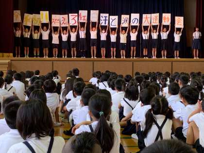 また、児童会から運動会のめあての発表がありました。各学級で話し合った意見を組み合わせて、1つのめあてができあがりました。令和元年度の運動会のめあては、「令和初!!燃えろ紅白 汗と涙の大運動会」です。めあてを達成できるよう、しっかりとがんばってほしいと思います。