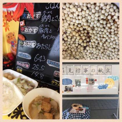 月見の行事献立として、芋を使った「鶏肉とさといもの煮もの」、だんごを使った「みたらしだんご」が出ました。