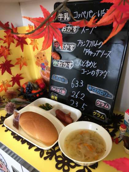 9月11日の給食は、「コッペパン、いちごジャム、牛乳、フランクフルトのケチャップソース、スープ、さんどまめとコーンのサラダ」えした。